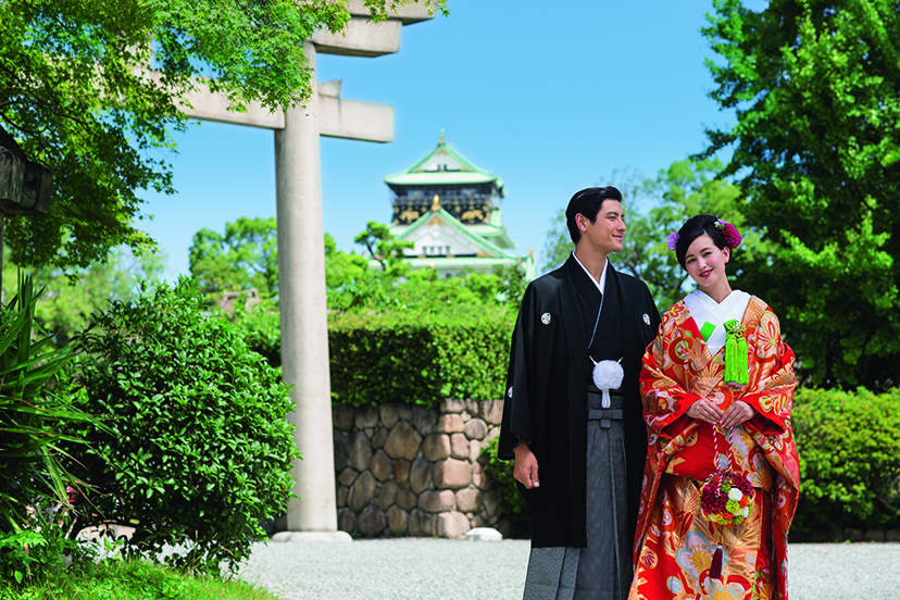 ホテルは天守閣と同じくらいの高さに創られているので、最上階でも見下ろすことなく大阪城の美しい姿を眺められるのだそう。最上階のチャペルでは、緑豊かな公園を眺めながら開放感いっぱいの挙式が叶います。和のスタイルを希望する新郎新婦には、大阪城内桜門正面に鎮座する「豊國神社」での本格的な神前式スタイルもおすすめです。