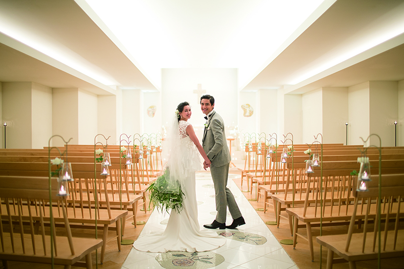 もうひとつのチャペルは、著名な銅版画家の山本容子さんのアートディレクションにより生まれた「エンジェルズ・アイ」です。チャペルロビーからの回廊やチャペルの壁面、バージンロードに施されたバラや天使のモザイク画は、山本容子さんの絵をモチーフに熟練の職人が天然石を使って仕上げたものです。ベンチにはサクラの木が使われ、天然素材が醸し出す温もりとヨーロッパの小さな村の教会のように懐かしい雰囲気が魅力。キャンドルウエディングの幻想的な美しさには、誰もが感動することでしょう。