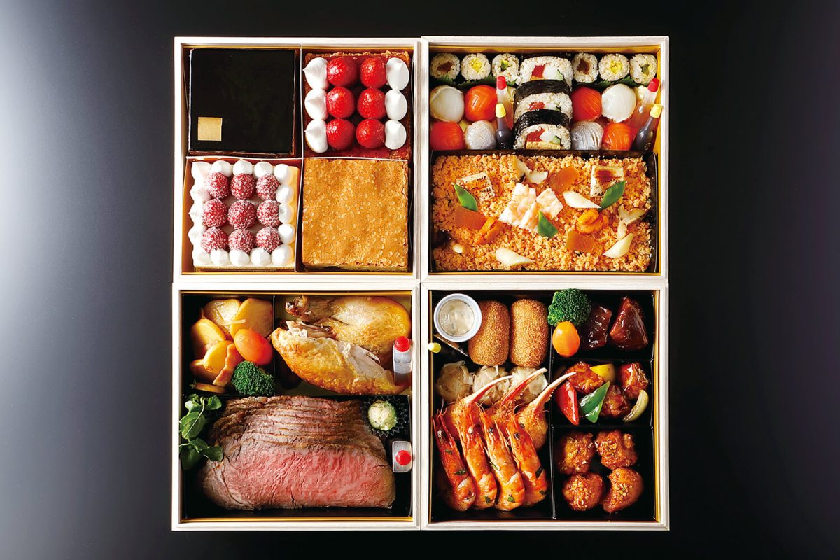 伝統のローストビーフをはじめ、ホテル自慢の和洋中料理とスーパーシリーズのスイーツなど全19品を詰めた贅沢なお重。好きなお重を1段から予約も可能。