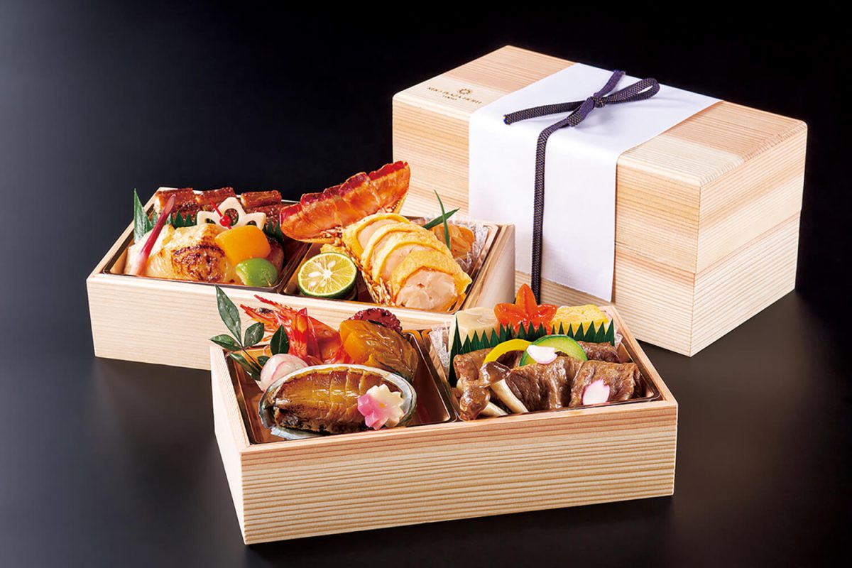 蝦夷あわび、四万十うなぎ、黒毛和牛、ロブスターなど豪華食材の数々を吟味し、腕によりをかけて仕立てた二段重。鰹節専門店の林久右衛門商店の最中のお吸い物付き。