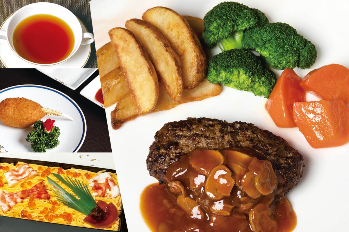 4つのレストランで人気の高いメニュー約40品を用意。ゲストの顔ぶれに合わせて好きな料理を組み合わせて。3日間かけて作られるオークラ伝統のコンソメスープは必食。